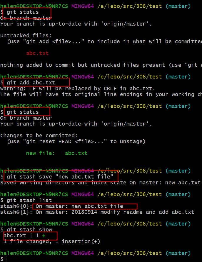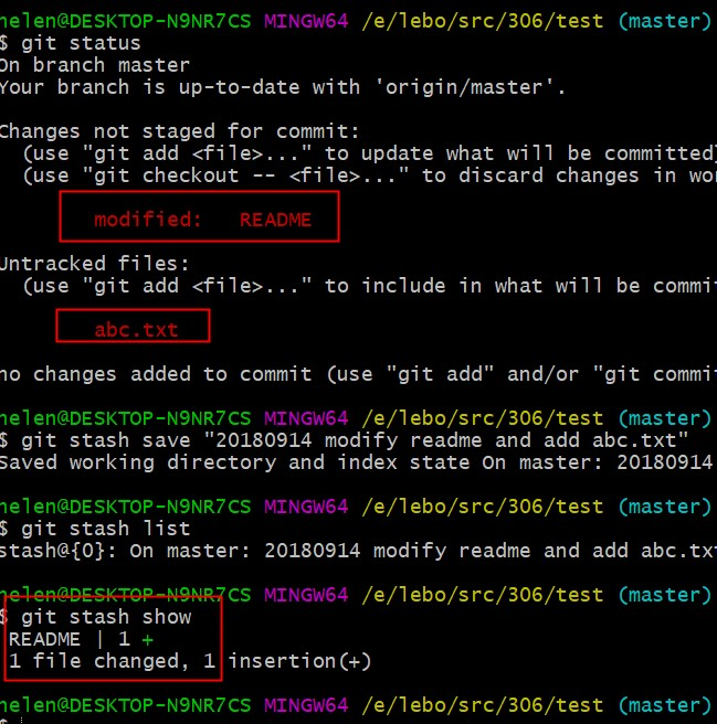 如上图:在git status 那一步很明显可以看出来,我修改了README,添加了新文件abc.txt,然后执行了git stash save后,在执行git stash list 可以看到刚才的save是的信息,然后使用git stash show ,只显示了README的改动被存起来了。